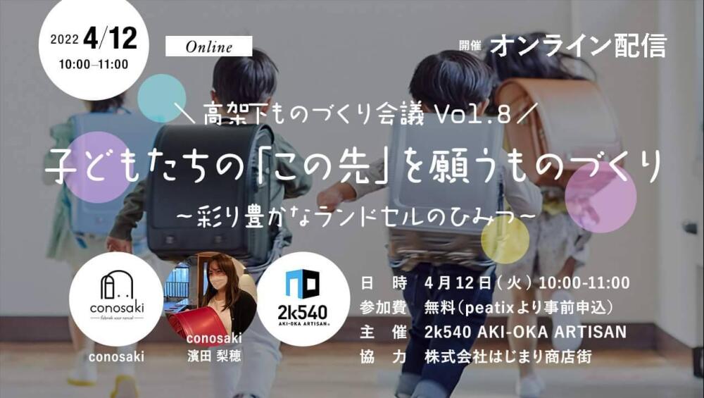 4月12日(火)10時より、2k540オンライントークイベント『高架下ものづくり会議 vol.8 子どもたちの「この先」を願うものづくり 〜彩り豊かなランドセルのひみつ〜』を配信いたします。