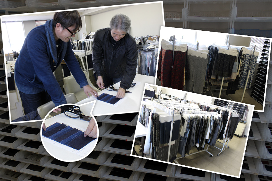 Blue Trickのものづくりはまず、生地づくりから始まります。商品の出来上がりをイメージしながら、生地屋さんで職人さんも交えて生地選びをします。生地は既製品ではなく、商品に合わせて糸から染めているのが私たちのこだわり。生地から商品をイメージすることもあれば、商品イメージから生地の色合いや柄を一から作ることもあります。