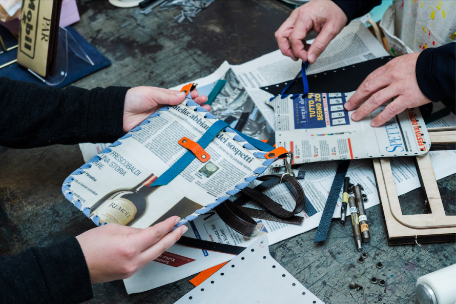 プラスティックコーティングを施したヨーロッパの新聞、リサイクルレザーなどの材料から色柄をお選びいただき、穴あけ、レースかがり、かしめなどの作業を楽しんでいただきます。