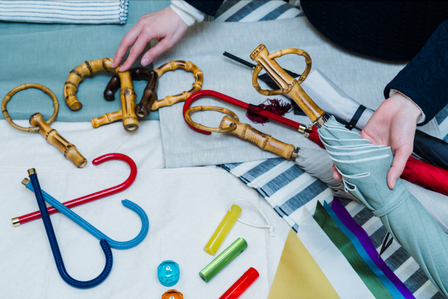 雨傘、日傘、長傘、折りたたみ傘‥そこから考える。傘の「スタイル」ワークショップです。傘の生地やフレーム、ハンドルを選んで、麻の日傘やマルチカラーの雨傘がつくれます。傘をつかうシーン、持ち歩く姿を思い浮かべながら、自分だけの傘をスタイリングしていただき、職人が仕上げます。