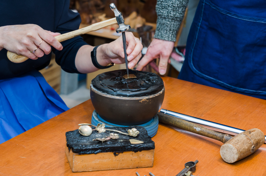 彫金の本場イタリアのフィレンツェで伝統を守る「打ち出し」の技術を使って、アクセサリー作りを体験して頂きます。西洋の「打ち出し」の技術は、教会の装飾品、テーブルウェアの食器類などの制作に用いられてきました。一枚の平らな金属板から鉄タガネと金槌を使って花のモチーフなどを作る立体造形です。