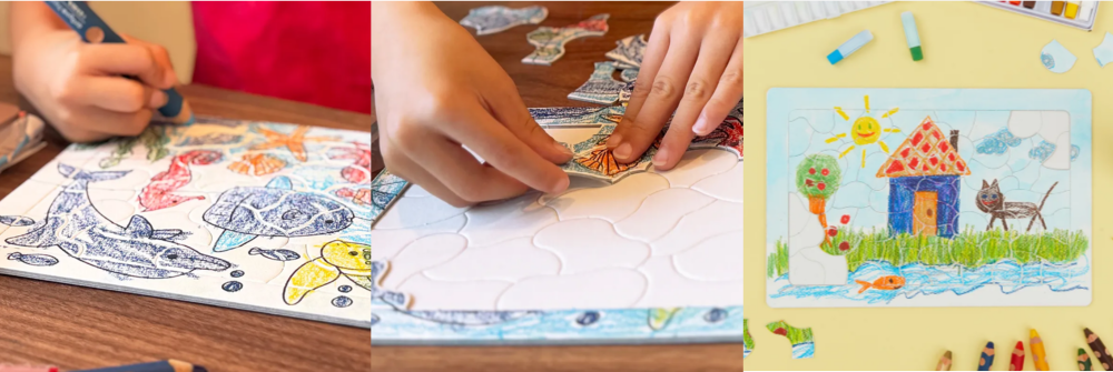 色鉛筆、水彩、クレヨン、マーカーなど、さまざまな筆記具や描画材に対応した、丈夫で描きやすいマルマンのオリジナル画用紙。その定評ある画用紙が、パズルになって登場!「ぬりえ」と「パズル」が合体した〈おえかきパズル〉を使ったワークショップを開催します。※事前申込不要
