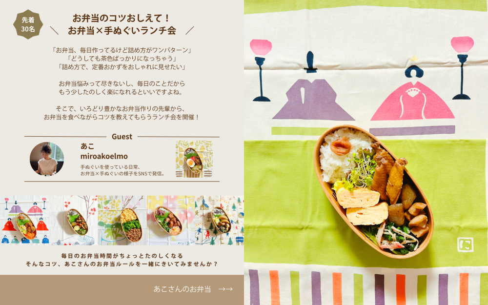 「あこさん」をお呼びして、お弁当×手ぬぐいの楽しさをお伝えいただきます!