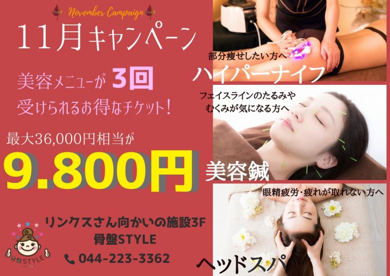 ハイパーナイフ・美容鍼・ヘッドスパのどれでも3回受けられるお得なチケット!
