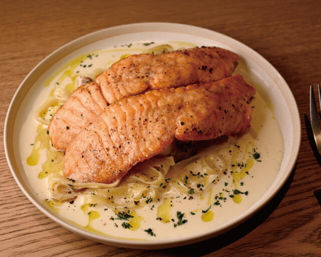 大きなサーモンムニエルが乗った、ボリューム感たっぷりのクリームパスタ。