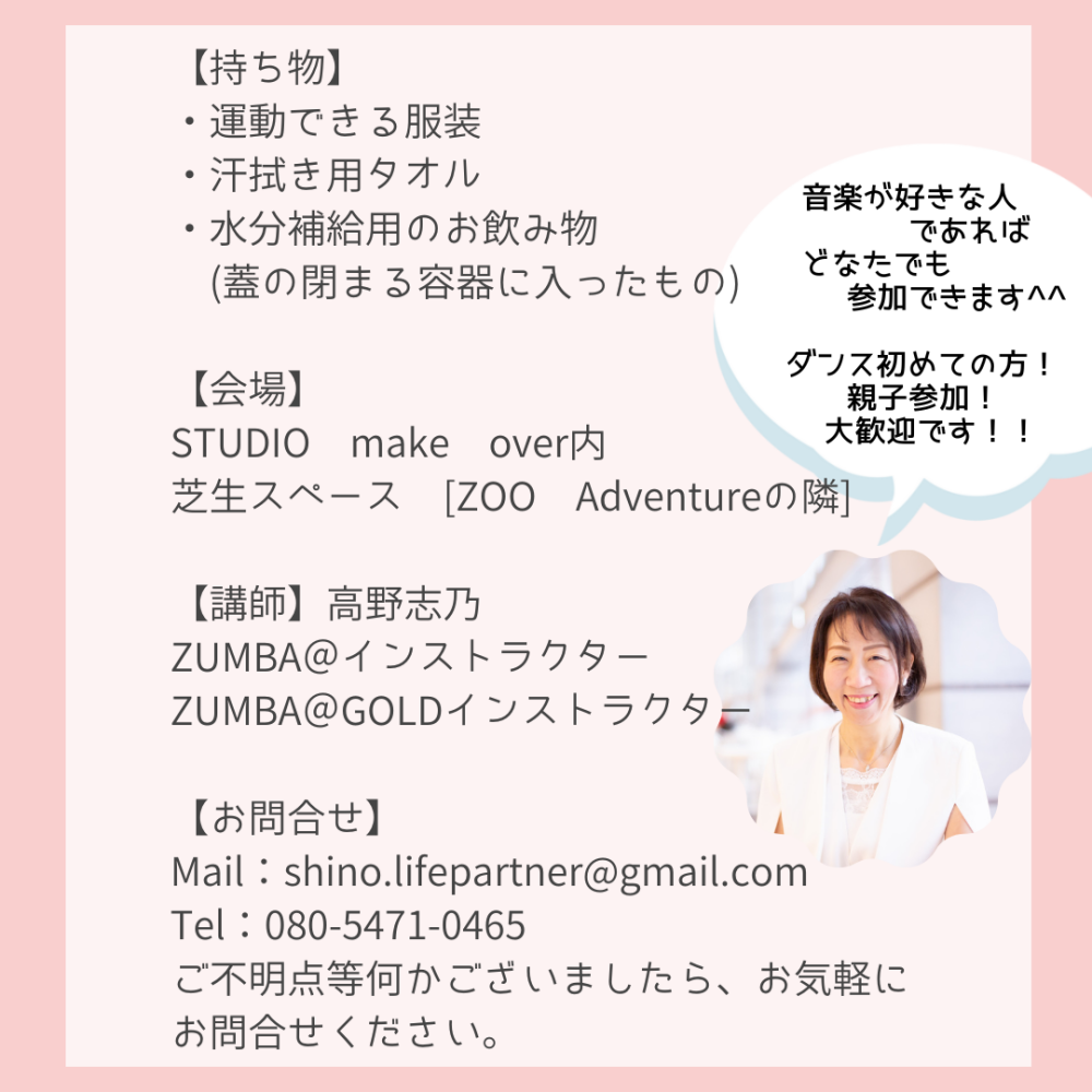 EVENT イベント情報 2026/04/07 「ZUMBA」で楽しく脂肪燃焼! ラテン系フィットネス「ZUMBAダンス」 ZUMBA(ズンバ)とは、ラテン系を中心としたフィットネスダンスです。音楽に合わせて楽しく脂肪燃焼しましょう!初めての方、親子参加も大歓迎! ■4/19 Sun. 12:15-12:55 ☆毎月第3日曜日開催!※毎月の開催の有無は講師へお問い合わせください。 ✓ご予約はこちら 前のページへ戻る
