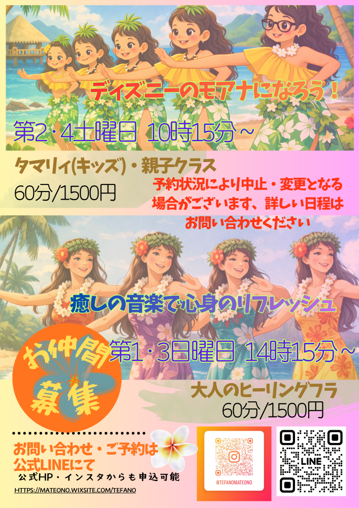 EVENT イベント情報 2026/04/10 楽しくゆったりヒーリングフラ 癒しの音楽で心身のリフレッシュ 南の島の伝統舞踊『フラダンス』音楽に身をゆだねて、癒しの時間。お子さまも初めての方も大歓迎!南国気分をぜひお楽しみください♪ 大人のヒーリングフラ■4/19 SUN. 14:15-15:15 キッズ・親子クラス■4/25 Sat. 10:15-11:15 ✓ご予約はこちら 前のページへ戻る