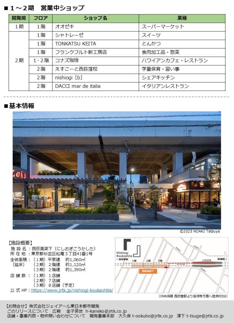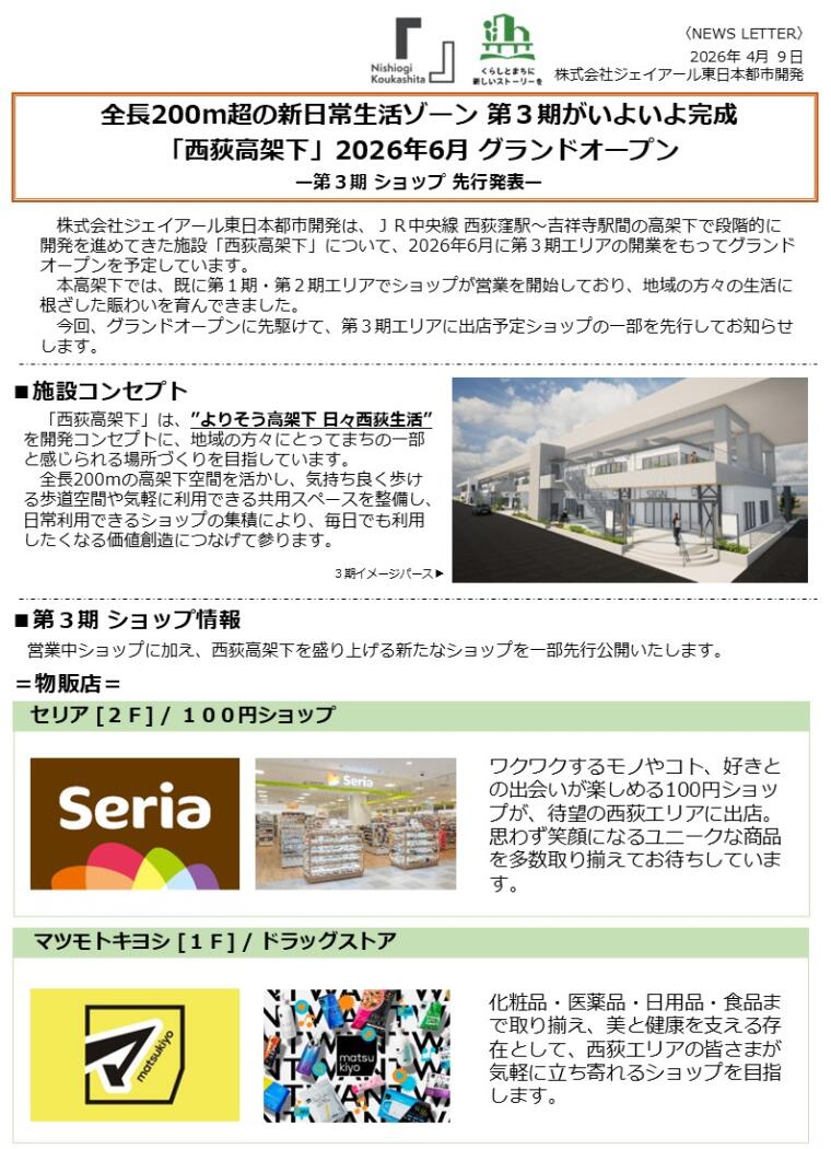 JR中央線西荻窪駅~吉祥寺駅間の高架下で段階的に開発を進めてきた施設「西荻高架下」について、2026年6月に第3期エリアの開業をもってグランドオープンを予定しています。本高架下では、既に第1期・第2期エリアでショップが営業を開始しており、地域の方々の生活に根ざした賑わいを育んできました。今回、グランドオープンに先駆けて、第3期エリアに出店予定ショップの一部を先行してお知らせします。
